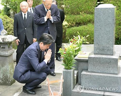 | △ 작년 8월 외조부 기시 노부스케 묘에 참배하는 아베 총리(교도.연합뉴스.자료사진) |