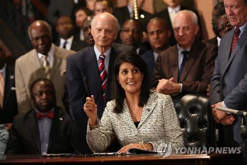 (댈러스=연합뉴스) 장현구 특파원 = 미국 사우스캐롤라이나 주의 니키 헤일리 주지사가 9일 오후 4시(현지시간) 흑백 차별 논란을 부른 남부연합기를 공공장소에서 퇴출하는 법안에 서명했다.