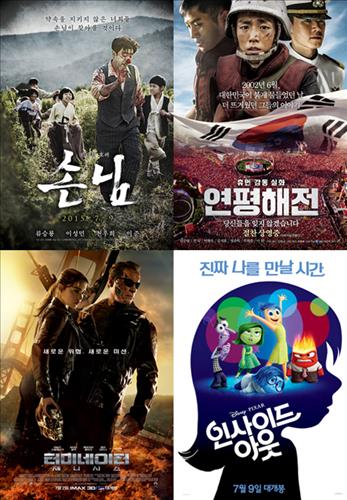 한국영화로는 '손님'과 '연평해전'이, 할리우드 영화로는 '터미네이터 제니시스', '인사이드 아웃'이 4파전을 벌이고 있다.
