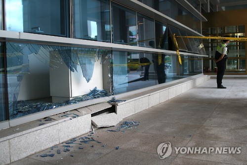 | △ 산산조각이 난 울산시청 본관 유리창 (울산=연합뉴스) 이상현 기자 = 10일 오전 울산시 남구 울산시청에서 정모(61)씨가 승합차로 건물을 들이받고 분신을 시도하다 경찰에게 붙잡혔다. 이날 정씨가 차량으로 들이받아 깨진 시청 본관의 유리창이 바닥에 흩어져 있다. 2015.7.10 leeyoo@yna.co.kr |
