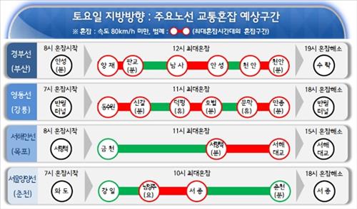 일요일 서울 방향으로 경부선은 오후 6시께 남이분기점∼옥산, 영동선은 오후 4시께 장평∼둔내터널 구간이 가장 혼잡할 전망이다.
