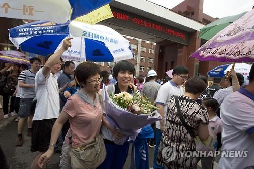 | △ 올해 6월 8일 중국 가오카오 시험 후 자녀에게 꽃다발 건네는 어머니(AP=연합뉴스DB) |