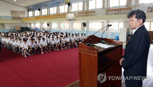 | △ 고 윤영하 소령 후배 만난 김학순 감독 (인천=연합뉴스) 윤태현 기자 = 영화 '연평해평'을 연출한 김학순 감독이 10일 오전 인천시 연수구 송도고등학교에서 강연에 앞서 학생들에게 인사하고 있다. 이 학교는 제2연평해전 전사자 윤영하 소령의 모교다. 2015.7.10 tomatoyoon@yna.co.kr |