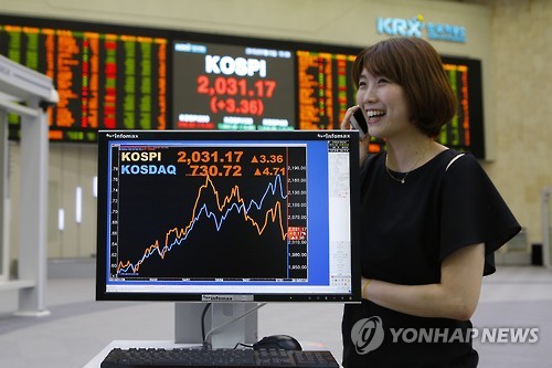 | △ 코스피, 3.36포인트 오른 2,031.17 마감 (서울=연합뉴스) 10일 서울 여의도 한국거래소 전광판에 코스피 지수가 전 거래일 대비 3.36포인트(0.17%) 오른 2,031.17으로 표시되고 있다. (한국거래소 제공) |