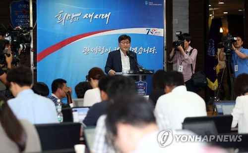 | △ 시내면세점 특허심사위원회 심의결과 발표 (영종도=연합뉴스) 신준희 기자 = 10일 오후 영종도 인천공항세관 수출입통관청사에서 특허심사위원장인 이돈현 관세청 차장이 새내 면세점 특허심사위원회 심의결과를 발표하고 있다. |