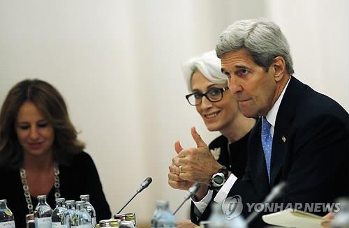 | △ (빈 AP=연합뉴스) 존 케리 미국 국무장관(오른쪽)이 10일(현지시간) 오스트리아 빈에서 열린 이란 핵 협상에 웬디 셔먼 국무부 정무차관(가운데)과 함께 참석했다. |