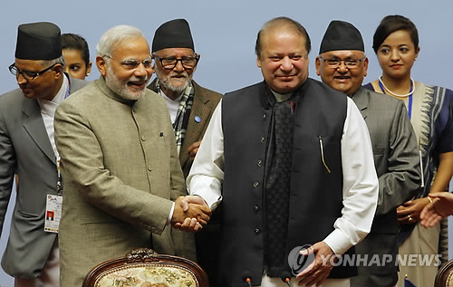 | △ 지난해 11월 27일 네팔 카트만두에서 열린 남아시아지역협력연합(SAARC) 정상회의에서 나렌드라 모디(왼쪽) 인도 총리와 나와즈 샤리프 파키스탄 총리가 악수를 하고 있다.(AP=연합뉴스 자료사진) |