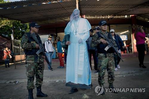 | △ 10일(현지시간) 프란치스코 교황이 방문하는 볼리비아 팔마솔라 교도소 인근에 교황의 실물 크기 사진이 내걸렸다.(AP=연합뉴스) |