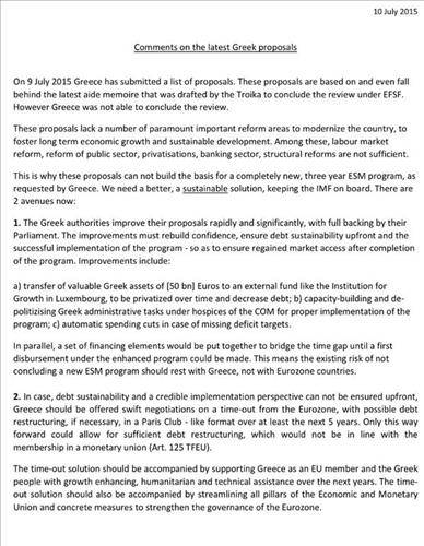 문서는 9일 그리스가 내놓은 제안에 대한 평가에서 노동시장, 공공분야, 민영화, 은행부문, 구조개혁에서 개혁방안이 충분하지 않다며 3차 구제금융 협상의 기반이 될 수 없다고 주장했다.