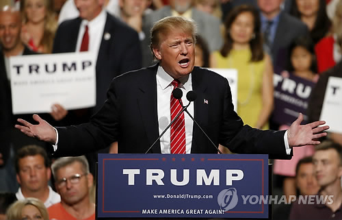 | △ 트럼프, 신났다! (피닉스 AP=연합뉴스) '노이즈 마케팅'으로 돌풍을 일으키며 최근 미국 공화당 등록 유권자 대상 여론조사에서 1위로 부상한 부동산 재벌 도널드 트럼프 미 공화당 대선 경선 후보가 11일(현지시간) 애리조나주 피닉스에서 약 3천500명의 청중이 모인 가운데 연설하고 있다. |