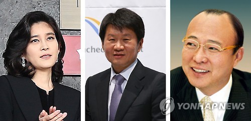 | △ HDC신라·한화, 서울 신규 면세점 '황금티켓' 획득 (서울=연합뉴스) '황금티켓'으로 불린 서울지역 신규 대형 면세점 특허권 2장을 놓고 벌인 대기업 간 싸움에서 현대산업개발과 호텔신라의 합작법인인 HDC신라면세점과 한화그룹 계열인 한화갤러리아타임월드가 승리했다. 왼쪽부터 이부진 호텔신라 사장,정몽규 현대산업개발 회장, 김승연 한화그룹 회장. 2015.7.10 photo@yna.co.kr |