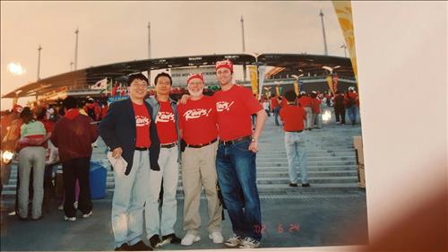 2002년 6월 24일 촬영된 이 사진에서 싱어 회장은 아들 고든 엘리엇과 붉은 악마 셔츠를 입고 머리에는 두건을 두른 채 포즈를 취하고 있다.