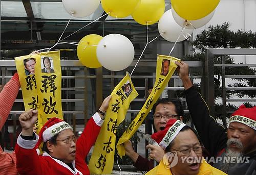 | △ 2014년 12월 25일 홍콩주재 중국연락판공실 밖에서 산타클로스 복장의 반중국 시위자들이 노벨평화상 수상자인 류샤오보(劉曉波), 변호사 푸즈창(浦志强) 등 투옥된 중국 인권운동가들의 사진을 단 풍선을 들고 이들의 석방을 요구하며 농성을 벌이고 있다. (AP=연합뉴스 자료사진) |