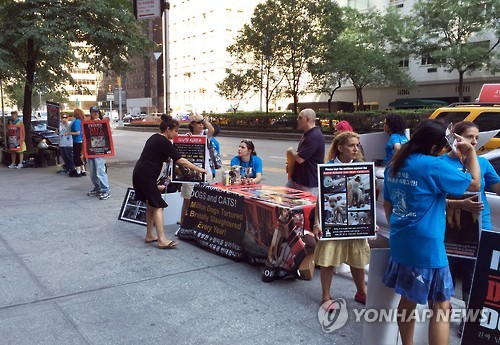 '뉴욕시 동물 연대'(NYC Animal Battalion) 회원 10여 명은 13일(현지시간) 미국 뉴욕 맨해튼 57번가에 있는 대한민국 뉴욕총영사관 앞에서 개고기 식용 반대 시위를 벌였다.