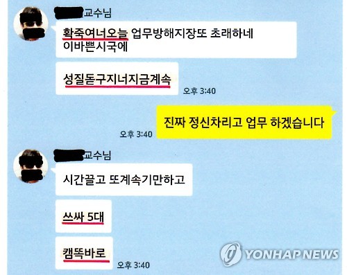 | △ "쓰싸 5대 캠 똑바로" (성남=연합뉴스) 자신이 대표를 맡고 있는 학회 사무국에 취업시킨 제자가 마음에 들지 않는다는 등의 이유로 수년간 가혹행위를 일삼은 대학 교수가 경찰에 구속됐다. 경기 성남중원경찰서는 폭력행위 등 처벌에 관한 법률 위반 등 혐의로 경기도 모 대학교 교수 A(52)씨 등 3명을 구속하고 C(26·여)씨를 불구속 입건했다고 14일 밝혔다. A씨가 카카오톡 단체방에서 D(29)씨에게 욕설을 하며 쓰싸(슬리퍼로 따귀)체벌을 지시한뒤 아프리카TV 영상으로 확인하면서 카메라를 똑바로 놓으라고 말하고 있다.2015.7.14<<성남중원서>> goals@yna.co.kr |