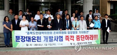 | △ (청주=연합뉴스) 김형우 기자 = 문장대 온천 개발 저지 충북도민 대책위원회는 지난 9일 오전 충북도의회 앞에서 온천 개발 중단을 촉구했다. 2015.7.9 |