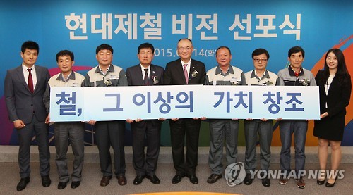 | △ 현대제철 비전 선포식 (서울=연합뉴스) 14일 서울 양재동 현대제철 본사에서 열린 '현대제철 비전 선포식'에서 우유철 부회장(왼쪽 다섯 번째)과 강학서 사장(왼쪽 네 번째), 각 공장 노조지회장 등 참석자들이 현대제철의 새로운 비전인 '철, 그 이상의 가치 창조' 푯말을 들고 기념촬영을 하고 있다. 2015.7.14 << 현대제철 제공 >> photo@yna.co.kr |