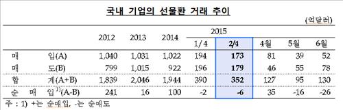 국내 기업의 선물환 거래 규모는 지난해 4분기 551억 달러를 나타냈으나 올해 1분기 들어 390억 달러로 151억 달러(29.2%)나 급감한 바 있다.