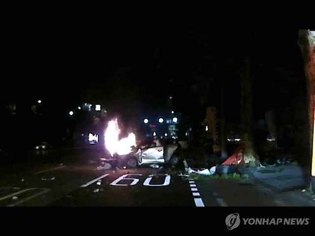 | △ 불 타는 승용차에서 부상자 구조 (대구=연합뉴스) 이덕기 기자 = 14일 새벽 대구 수성구 중동네거리에서 K3 승용차와 NF쏘나타가 충돌, 쏘나타 운전자 심모(27)씨가 불이난 K3 차량 탑승자들을 끄집어내고 있다. 이 사고로 2명이 숨지고 4명이 부상했다. 2015.7.14. <<대구지방경찰청>> duck@yna.co.kr |