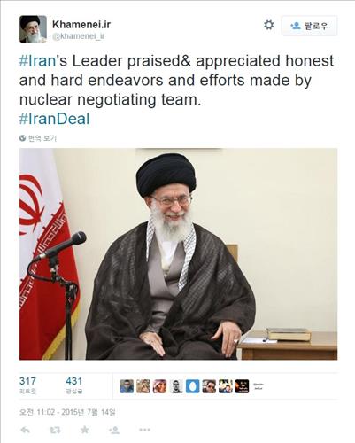 (서울=연합뉴스) 최평천 기자 = 이란 최고지도자 아야톨라 알리 하메네이가 "이란 핵협상 팀의 '진실하고 힘든 노고'에 찬사와 감사를 보낸다"고 트위터를 통해 밝혔다.