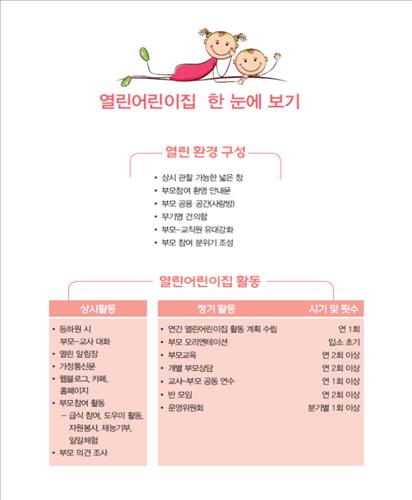 가이드라인에는 부모가 내부를 관찰할 수 있도록 넓은 창을 설치할 것, 부모가 급식·도우미·자원봉사 등으로 참여할 수 있도록 유도할 것 등의 내용이 담겼다.