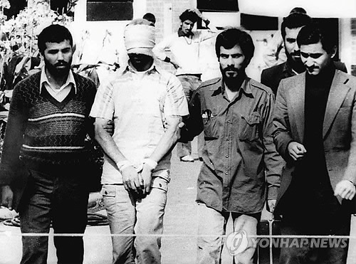 | △ 지난 1979년 이란 대학생들의 테헤란 주재 미국 대사관 점거 때 이란측에 붙잡혀 이송 중인 미국인 인질 (AP=연합뉴스 자료사진) |