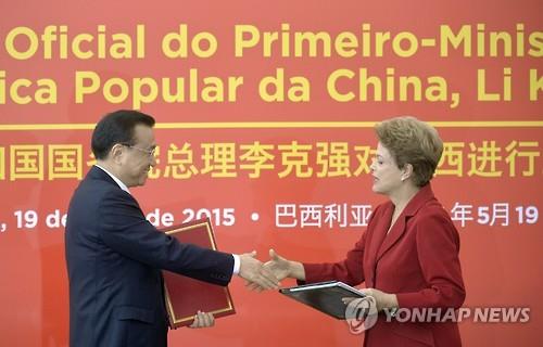 | △ 지난 5월 브라질리아를 방문한 리커창 중국 총리(왼쪽)가 지우마 호세프 브라질 대통령과 투자협정에 서명했다.(AP=연합뉴스 자료사진) |