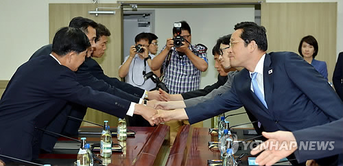 | △ 지난해 4월 열린 개성공단 남북공동위원회 제5차 회의에서 우리 측 이강우 통일부 남북협력지구발전기획단장(오른쪽)과 북측 박철수 중앙특구개발지도총국 부총국장(왼쪽)이 회담에 앞서 악수하고 있다. (연합뉴스 자료사진) |