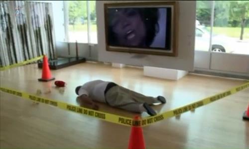 사건 발생 당시 브라운과 똑같은 복장을 한 실물 크기의 마네킹이 길바닥에 얼굴을 댄 채 엎어져 있고, 주위에 경찰의 '접근 금지 테이프'가 둘러쳐져 있다.