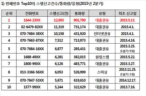 2분기 민폐번호 상위 10개의 수신, 발신, 문자 건수를 합한 총 통화량은 539만9천312건이었으며 이 중 1위인 1644-23XX 번호로는 총 90만 1천790건의 통화가 이뤄진 것으로 분석됐다.
