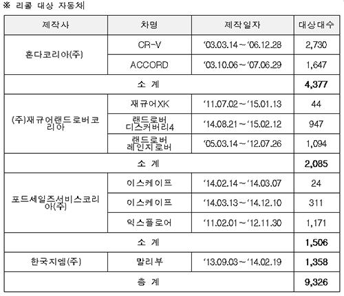 혼다·재규어·포드·한국지엠 등 9천300여대 리콜