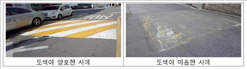 그러나 재도색이 요구된 과속방지턱의 평균 반사성능은 흰색이 28.73mcd/(m2·Lux), 노란색이 15.26mcd/(m2·Lux)로 최소 기준의 30∼40% 수준에 그쳤다.