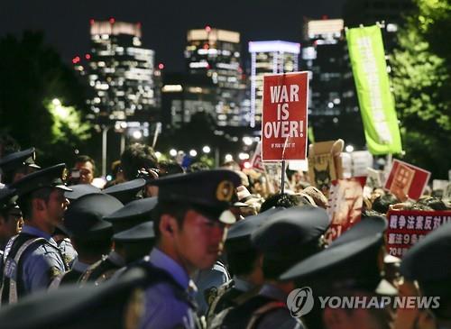 | △ 2015년 7월 14일 일본 국회 주변에서 집단자위권 등을 행사하는 안보법안 강행 처리에 반대하는 시위가 열리는 장면(EPA=연합뉴스) |