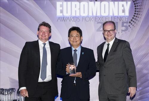 | △ (서울=연합뉴스) 하나은행이 16일 홍콩 샹그릴라호텔에서 개최된 유로머니(Euromoney)지의 'Awards for Excellence 2015'에서 '대한민국 최우수 은행(Best Bank in Korea)'으로 3년 연속 선정됐다. 김병호 하나은행장(사진 가운데)이 토니 새일 유러머니지 아시아 CEO(사진 왼쪽), 클리브 호우드 유러머니지 편집장(사진 오른쪽)과 함께 기념촬영을 하고 있다. <<하나은행 제공>> |