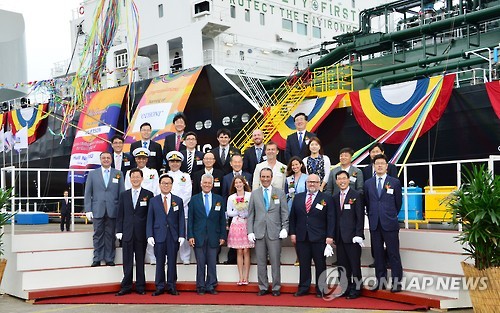 | △ 현대미포, 첫 LEG 운반선 명명식 (울산=연합뉴스) 현대미포조선은 창사 이래 처음으로 액화에틸렌가스(LEG) 운반선을 건조했다고 17일 밝혔다. 이날 울산시 동구 현대미포조선 안에서 명명식이 열렸다. 2015.7.17. << 현대미포조선 제공 >> canto@yna.co.kr |