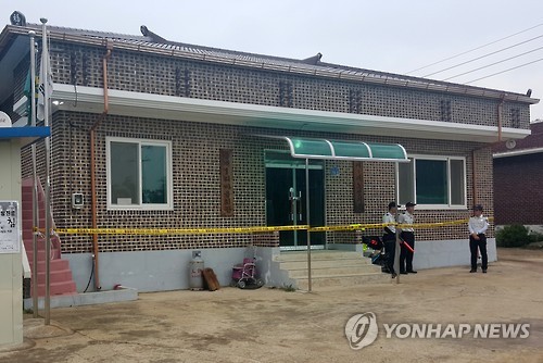 | △ 음료수 독극물 사건과 관련해 경찰이 지난 15일 경북 상주시 공성면 금계1리 마을회관 앞에 선을 치고서 통제하고 있다. |