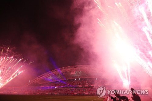 | △ 올스타전 끝 (안산=연합뉴스) 신준희 기자 = 17일 경기도 안산 와스타디움에서 열린 프로축구 K리그 올스타전 팀 슈틸리케와 팀 최강희의 경기가 3대3 무승부로 끝났다. 경기가 끝나자 경기장에 폭죽이 터지고 있다. 2015.7.17 hama@yna.co.kr |