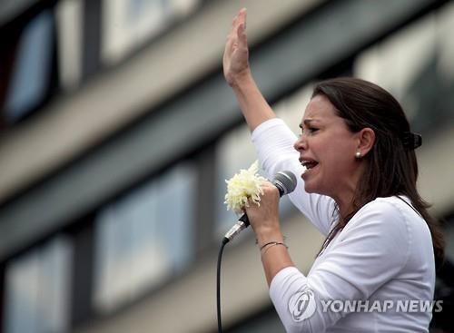 | △ 지난 5월 베네수엘라 수도 카라카스에서 열린 반정부 시위에서 야당 의원 출신인 마리아 코리나 마차도가 연설을 하고 있다.(AP=연합뉴스DB) |