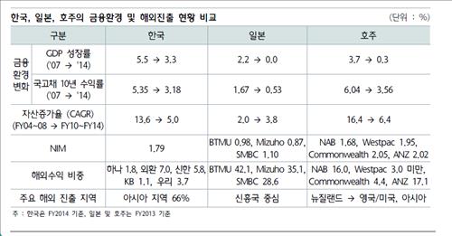 이런 실적은 내수시장 포화와 저금리라는 비슷한 환경에 처한 일본·호주 은행들의 해외진출 성과에 비하면 미미한 수준이라고 보고서는 진단했다.