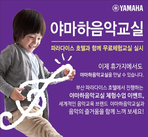 (서울=연합뉴스) 전준상 기자 = 세계적인 악기음향전문기업 야마하뮤직코리아는 여름 휴가철을 맞아 24일부터 26일까지 부산 파라다이스 호텔에 투숙한 4∼7세 어린이를 대상으로 무료 음악체험교실을 운영한다.