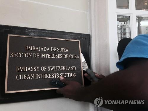 | △ 20일 쿠바 대사관 개관을 앞두고 지난 15일 쿠바 이익대표부 현판이 제거되고 있다. (AP=연합뉴스) |