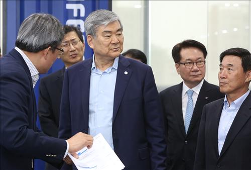 | △ 인천창조경제혁신센터 현장에서 설명을 듣고 있는 한진그룹 조양호 회장(왼쪽에서 두번째). 한진그룹 제공. |