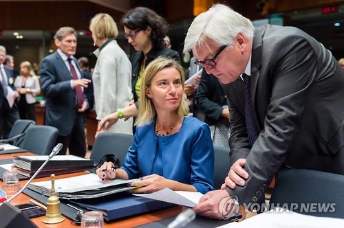 | △ 20일(현지시간) 브뤼셀에서 열린 EU 외무장관 회의에서 모게리니(왼쪽) EU 외교안보 고위대표가 슈타인마이어 독일 외무장관과 대화하고 있다.(AP=연합뉴스) |