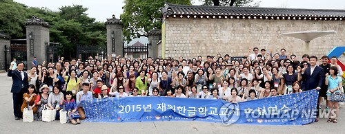 | △ 58개국 한글학교 교사들, 모국서 '맞춤형 교육' 연수 (서울=연합뉴스) 강성철 기자 = 전 세계 59개국 한글학교 교사 195명이 재외동포재단 초청으로 역량 및 전문성 강화를 위한 집중연수에 들어갔다. 21일 서울 종로구 국립민속박물관에서 열린 개회식에 참석한 교사들이 기념촬영을 하고 있다. 2015.7.21 wakaru@yna.co.kr |