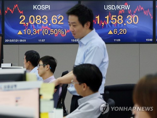 | △ 코스피·환율 상승 (서울=연합뉴스) 박동주 기자 = 코스피가 3거래일 만에 반등해 2,080선을 회복한 21일 서울 중구 외환은행 본점 딜링룸에서 직원들이 업무를 보고 있다. 코스피는 이날 10.31포인트(0.50%) 오른 2,083.62에 장을 마감했다. 외환시장에서 원·달러 환율은 6.2원 오른 1,158.3원으로 마감했다. |