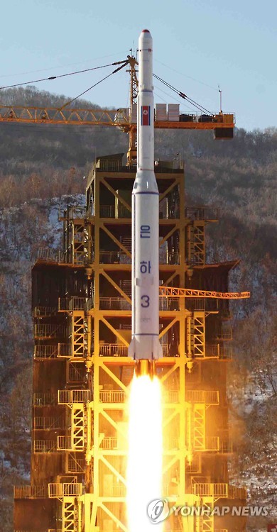 | △ 북한, 서해 동창리에 67m 장거리 미사일 발사대 설치 (서울=연합뉴스) 북한이 중국에 가까운 서해 발해만 인근 지역에 67m 규모의 대형 장거리 미사일 발사대를 세운 정황이 포착됐다. 지난 2013년 말부터 기존 50m 높이의 발사대 증축 공사를 시작한 북한은 최근 17m를 더 높여 67m 크기의 발사대 증축 공사를 거의 마무리했다고 정부의 한 소식통이 22일 밝혔다. 평안북도 철산군 동창리 '서해 위성발사장'에 세워진 이 장거리 로켓 발사대에서는 북한이 지난 2012년 발사한 '은하-3호' 장거리 로켓(30m) 보다 2배 크기의 장거리 로켓을 발사할 수 있을 것으로 군과 정보 당국은 분석했다. 북한 조선중앙통신이 2012년 12월 보도한 평안북도 철산군 동창리 서해위성발사장에서 발사되고 있는 북한 장거리 로켓 은하3호. 2015.7.22 << 연합뉴스 DB >> photo@yna.co.kr |