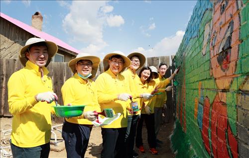 | △ 한국증권금융꿈나눔재단 박재식 이사장(왼쪽에서 세 번째)이 창립60주년을 기념으로 몽골 울란바토르 다르이히 희망학교에서 낡은 담장에 그림을 그리며 봉사활동을 하고 있다. 꿈나눔 재단은 몽골 봉사활동 기간동안 ICT교육센터 건립, 재능기부 등 다양한 활동을 펼칠 예정이다. <<사진제공=한국증권금융>> |