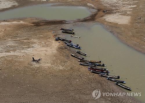| △ (나콘라차시마<태국> AP=연합뉴스 자료사진) 태국 나콘라차시마 주에 위치한 람타콩댐 하류가 지난달 29일 바닥을 드러내 어선이 발묶여 있다. 태국에서는 5월 마지막 주부터 우기가 시작됐지만 나콘라차시마 주에서는 반 루에암 지역에 단 한 차례 비가 내렸다. 태국의 20%에 해당하는 지역이 가뭄으로 인해 긴급재난구역으로 선포됐다. |