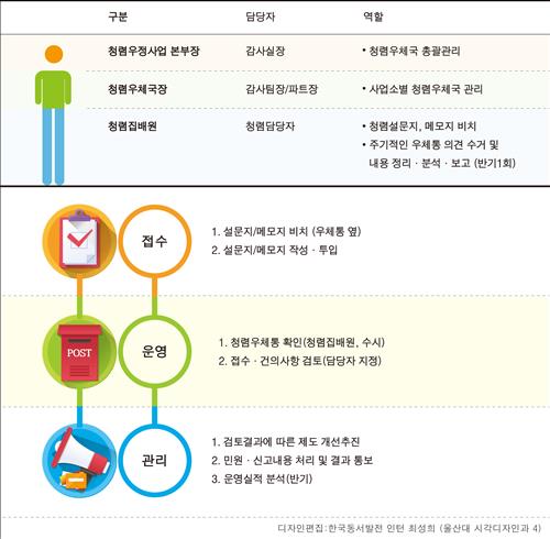 우체통에 들어온 고객들의 의견은 청렴 집배원이 수거해 건의사항을 검토하고 담당부서에 통보하며, 담당부서에서는 조치 계획을 세워 처리한 뒤 그 결과를 다시 청렴 우체국에 통보한다.