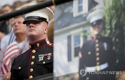 | △ 지난 16일(현지시간) 미국 테네시 주 채터누가에서 발생한 총기 난사 참사로 희생된 미국 해군 스킵 웰스 하사에 대한 추모식이 21일 그의 고향인 조지아 주 매리에타에서 열렸다. 웰스 하사의 동료가 눈물을 흘리며 애도하고 있다. (AP=연합뉴스) |